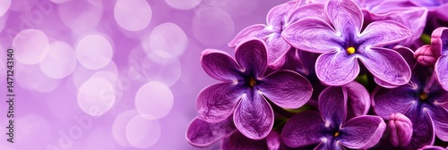 Close-up of vibrant purple lilac blossoms against a soft, blurred background of bokeh. Detailed view of petals, stamens, and buds