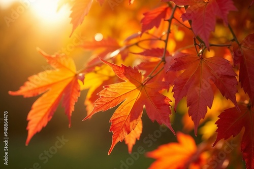 Close-up of vibrant red and orange maple leaves illuminated by warm sunlight in autumn