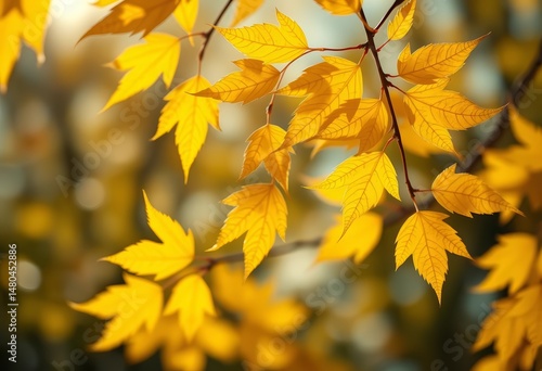 Close-up of vibrant yellow autumn leaves against a softly blurred, luminous background, september, environment