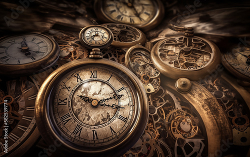 Close-up of vintage pocket watches with intricate designs, gears, and cogs in focus showing passage of time.