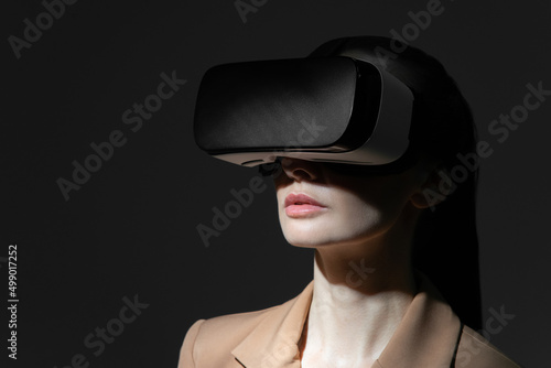 Close-up of virtual reality glasses. Use of augmented reality glasses in business processes. Businesswoman portrait in low key.