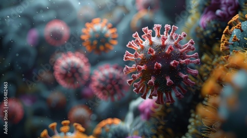 Close-up of virus particles with vibrant colors in a microscopic view, healthcare and biology concept