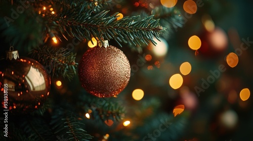 Close-up of warm white LED lights on a Christmas tree, surrounded by festive ornaments, soft glow