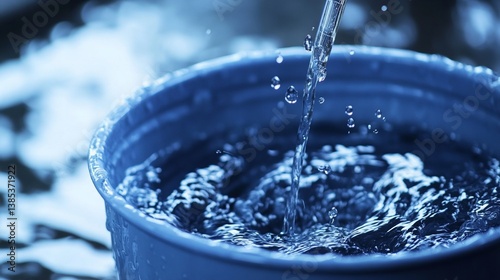 Close-up of water flowing into blue bucket creating splash and ripples