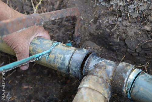 Closeup of water pipeline cutting by male plumber's hand with old saw to repair pipeline leakage.