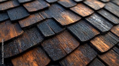 Close-up of weathered wooden shingles, texture, surface, construction material
