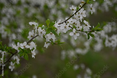 Close-up of white flowering plum branches, close-up of green flowering tree branches with young leaves, Mother's Day Poster Card, Women's Day Poster