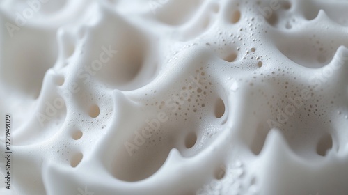 Close-up of white foam with intricate patterns and small bubbles forming an abstract texture