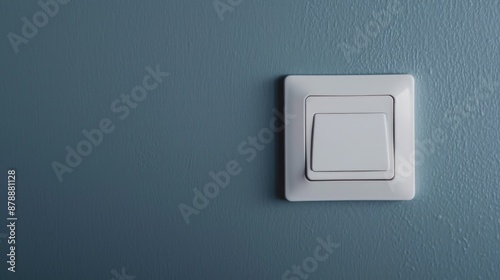 Closeup of white light switch turned off on gray wall energy conservation concept horizontal image with space for text
