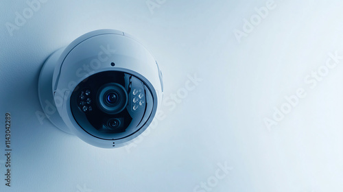 Closeup of white security camera isolated on white background. cctv surveillance technology equipment, electronic monitoring recording device, smart, wireless, house private property protect.