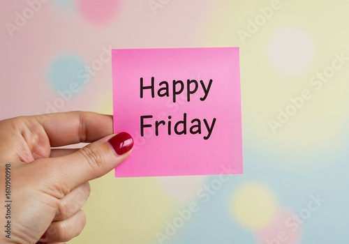 Close-Up of Woman’s Hand Holding Pink Sticky Note with Happy Friday Message on Pastel Bokeh Background