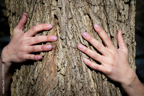 Close-up of Woman's Hands embracing a Tree Trunk in the Forest. Tree hugging. Back to Nature concept. Touch and Love the Nature.