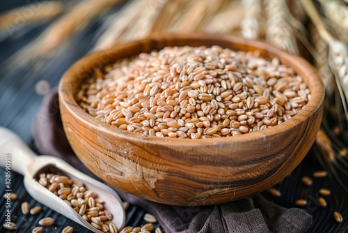 Close-up of wooden bowl filled with sesame seeds sits next to spoon on table