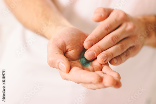 Closeup of young doctor rubbing hands with sanitizer for protection against coronavirus COVID-19. Man hands appying and washing hands with antibacterial gel as preventive meause against nCov-19