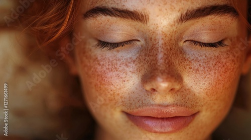 Close-Up of Young Woman with Freckles and Soft Expression in Natural Light