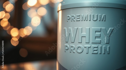 Close-up on container of protein powder against blurred background of holiday-themed decorative lights.