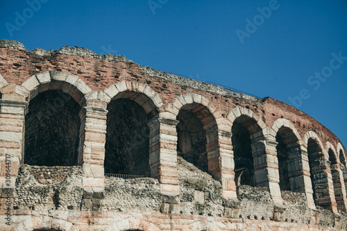 Closeup part of the wall of the ancient Roman Colosseum or Arena in Verona in Italy.