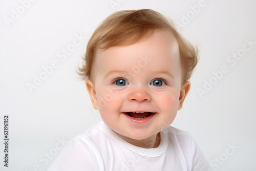 Closeup photo of a cute little baby boy child a smile and laugh isolated on white background