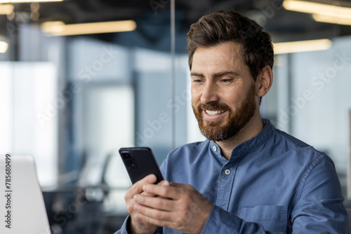 Close-up photo of a tired young man sitting at his desk in the office and using a mobile phone