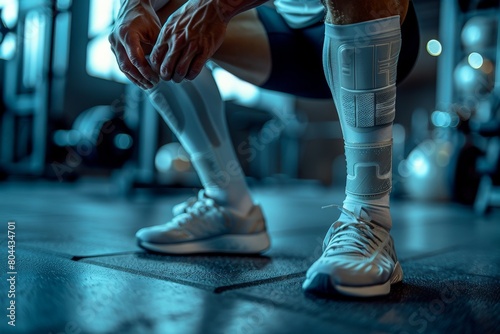 Close-up photo of an athlete's hands adjusting a knee brace, preparing for a workout and ensuring joint safety