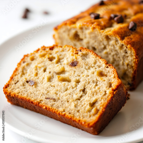 Close-up photo shot of a slice of freshly baked banana bread with a moist