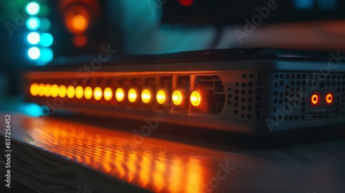 closeup photograph of a modern internet router device with glowing led lights showcasing the technology that enables wireless home networking and connectivity