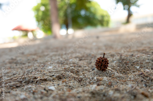 Close-up, Pine cones falling on a sandy beach with blurred pine trees in the background