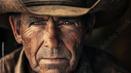 Close-up portrait of a cowboy with a weathered face, soft lighting highlighting his rugged features and worn hat