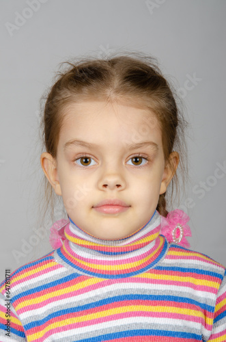 Close-up portrait of a disheveled five-year-old girl wearing a colored striped sweater on a gray background
