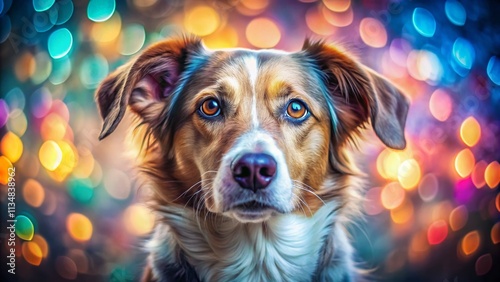 Close-Up Portrait of a Dog's Head Showcasing Vibrant, Abstract Fur with a Soft Pastel Colored Bokeh Background, Perfect for Pet Lovers and Animal Enthusiasts