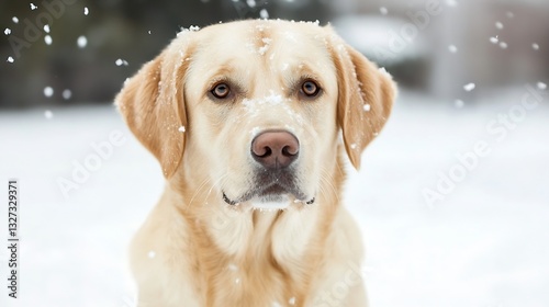 Closeup portrait of a fluffy yellow Labrador Retriever dog with snowflakes gently falling on its fur : Generative AI