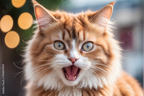 Close-up portrait of a ginger cat with white markings, looking startled with its mouth open.