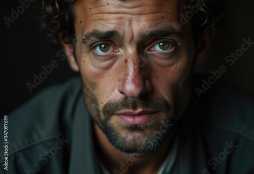 Close-up portrait of a man with a serious expression, showcasing his weathered face and intense gaze.
