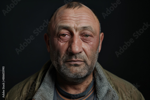 Close-up portrait of a middle aged man of Middle Eastern descent, studio photo, against a sleek gray studio backdrop