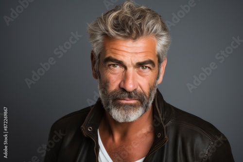 Closeup portrait of a serious mature man with gray hair and beard in a leather jacket looking at the camera on a grey background