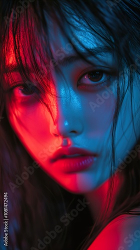 Close-up Portrait of a Woman in Neon Red and Blue Light