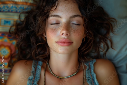 Close-up portrait of a woman with freckles and curly hair, relaxing on a bed in blue top, eyes closed