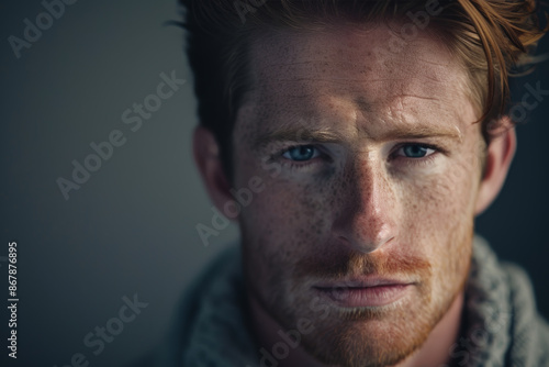 Close-up portrait of a young man of European descent, studio photo, against a sleek gray studio backdrop