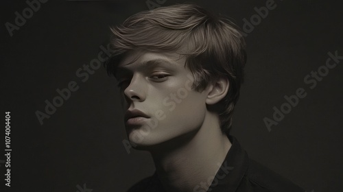 Close-Up Portrait of a Young Man with Stylish Hair and Intense Expression Against a Dark Background, Capturing Natural Beauty and Unique Features