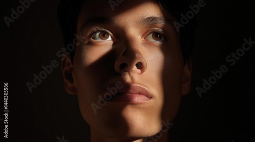 Close-up portrait of a young man's face. the focus is on his eyes, which are looking up towards the sky.