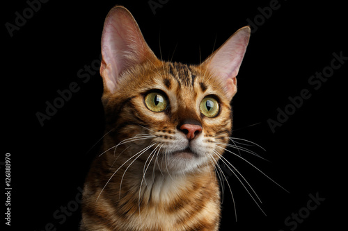 Close-up Portrait of Adorable breed Bengal kitten in front view, Curious Looking in camera with beautiful eyes isolated on Black Background