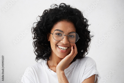 Close-up portrait of Afro American woman with dark curly bushy hair wearing glasses and white top holding hand on cheek looking at camera with shy charming smile feeling enjoyment and shyness