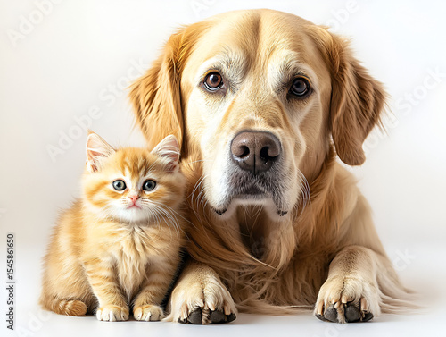 Close-up portrait of an adorable domestic cat and dog, cute isolated pets on white