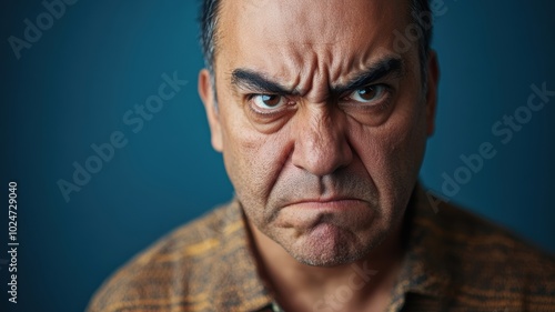 Close-up portrait of an angry man with a deeply furrowed brow and intense expression, glaring directly at the camera, set against a blue background.