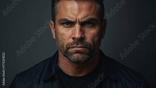 Close-up portrait of an angry middle-aged man standing against a dark background.