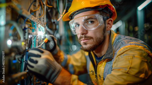 Close-up portrait of an electric engineer worker in safety gear with tools, against industrial background