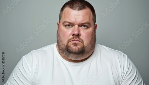 Close-up portrait of Caucasian man wearing white t-shirt. Big man with green eyes looking directly at camera. Expression on face skeptical and suspicious. Indoor shot.