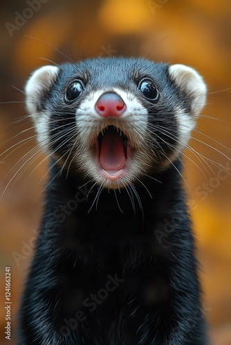Close-up portrait of excited black ferret with open mouth and bright pink nose against blurred autumn background, showing playful expression and whiskers.
