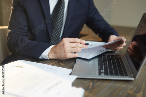Closeup portrait of unrecognizable successful businessman analyzing contract documents at desk with laptop