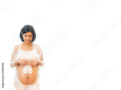 Closeup pregnant belly with cute tiny baby shoes. Concept of pregnancy, gynecology, preparation. Beautiful pregnant woman in shirt in white background. Woman holding big pregnant stomach.